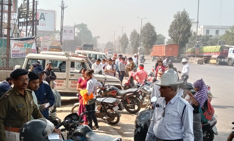 यातायात पुलिस दुर्ग द्वारा यातायात जागरूकता कार्यक्रम के साथ बिना हेलमेट दो पहिया वाहन चालन पर की गई सख्ती