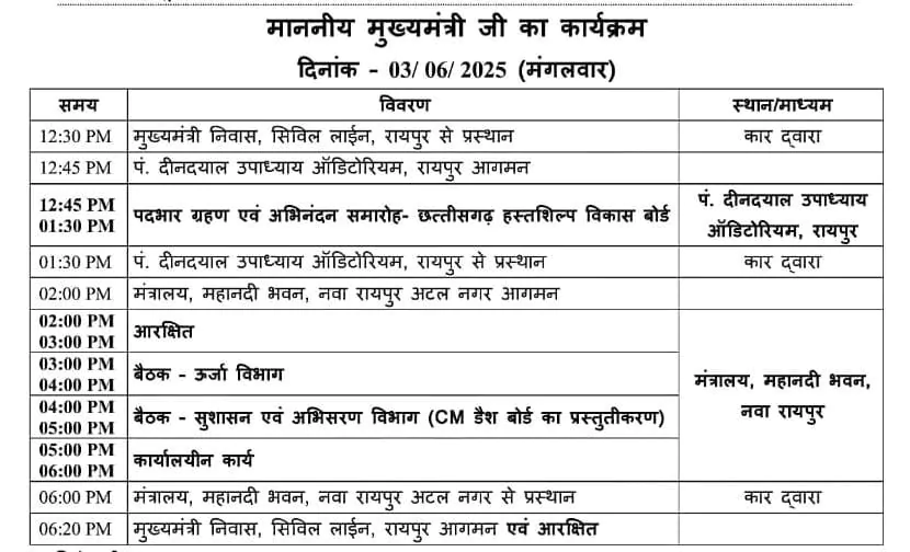 दोपहर 1:00 बजे: गृह विभाग की समीक्षा बैठक में भाग लेंगे। इस दौरान प्रदेश की कानून व्यवस्था और नक्सल प्रभावित क्षेत्रों की स्थिति पर चर्चा होगी।