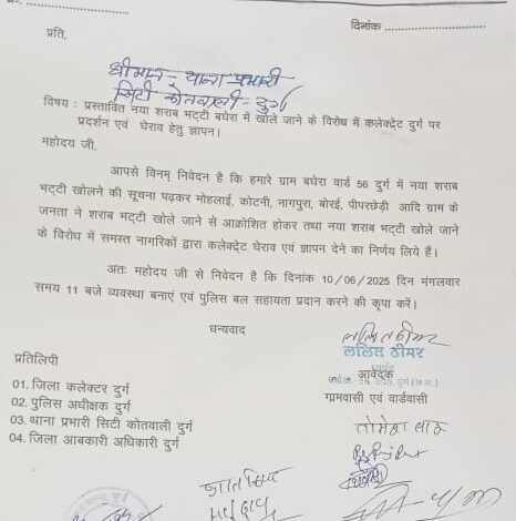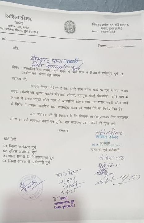 दुर्ग। वार्ड क्रमांक 56 साईं नगर बघेरा में खुल रही शराब भट्टी के विरोध में पार्षद ललित ढीमर के नेतृत्व में स्थानीय नागरिकों में जबरदस्त आक्रोश देखा जा रहा है। शराब भट्टी की स्थापना को लेकर क्षेत्रीय जनता ने खुला विरोध जताया है और प्रशासन से इस फैसले को तत्काल रद्द करने की मांग की है।