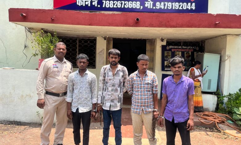 अपना नाम 01. अमित पाण्डेय पिता अनिल पाण्डेय उम्र 28 वर्ष 02. गौरव यादव उर्फ आसू पिता रामनेत यादव उम्र 19 वर्ष 03. सुमीत पाल पिता गौतम पाल उम्र 27 वर्ष एवं एक अन्य अपचारी बालक सभी निवासी स्टेशन मरोदा एचएससीएल कालोनी दुर्गा मंदिर थाना नेवई जिला दुर्ग 04. सलमान कुरैशी पिता गुलाब कुरैशी उम्र 19 वर्ष निवासी आशा नगर वार्ड 21 रेवाडीह राजनांदगांव थाना बसंतपुर जिला राजनांदगांव का रहने वाला बताये