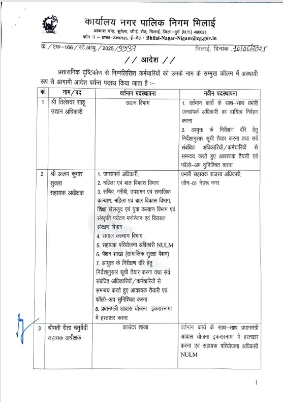 नगर निगम भिलाई में ट्रांसफर आदेश जारी: जनसंपर्क अधिकारी बदले, तिलेश्वर साहू को मिली PRO की जिम्मेदारी – देखें पूरी सूची
