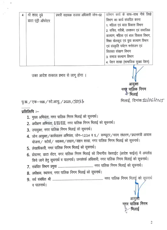 डाटा एंट्री ऑपरेटर शरद दुबे, जो पहले से ही जोन-02 में सहायक राजस्व अधिकारी के पद पर कार्यरत हैं, उन्हें अब महिला एवं बाल विकास विभाग, समाज कल्याण, संस्कृति-पर्यटन, पेंशन शाखा जैसी प्रमुख योजनाओं और विभागों की जिम्मेदारी भी सौंपी गई है।