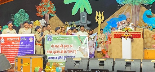 जिसकी शुरूवात कथा वाचक पंडित प्रदीप मिश्रा जी महाराज द्वारा कथा स्थल मंच पर गाय के बछिये को रेडियम पट्टी पहनाकर इस अभियान की शुरूवात की गई। कथा सुनने आए लगभग दो लाख श्रद्धालुओं को पंडित जी द्वारा दो पहिया वाहन चलाते समय हेलमेट लगाने, चारपहिया वाहन चलाते समय सिट बेल्ट लगाने एवं सड़क दुर्घटनाओं से बचने हेतु यातायात नियम का पालन करने मंच के माध्यम से श्रद्धालुओ से अपील की गई साथ ही दुर्ग पुलिस की अन्य जागरूकता कार्यक्रम एवं कथा स्थल पर की गई व्यवस्था की प्रशंसा की गई।