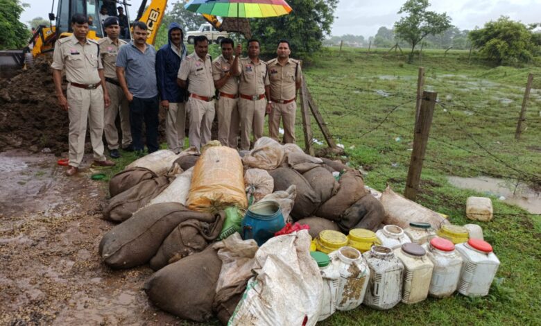 नशे के विरुद्ध रानीतराई पुलिस की बड़ी कार्रवाई: ग्राम घोरारी में 30 लीटर महुआ शराब और 5 क्विंटल महुआ लाहन जप्त, आरोपी फरार