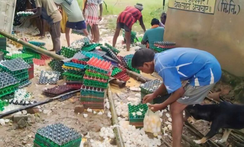 अंडों की लूट पर जुटी ग्रामीणों की भीड़