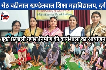 दुर्ग | सेठ बद्रीलाल खण्डेलवाल शिक्षा महाविद्यालय, दुर्ग में शनिवार को पर्यावरण संरक्षण और जागरूकता को बढ़ावा देने हेतु इको-फ्रेंडली गणेश निर्माण कार्यशाला का आयोजन किया गया। इस कार्यशाला में बी.एड. के छात्राध्यापकों ने मिट्टी से गणेश प्रतिमा बनाना सीखा।