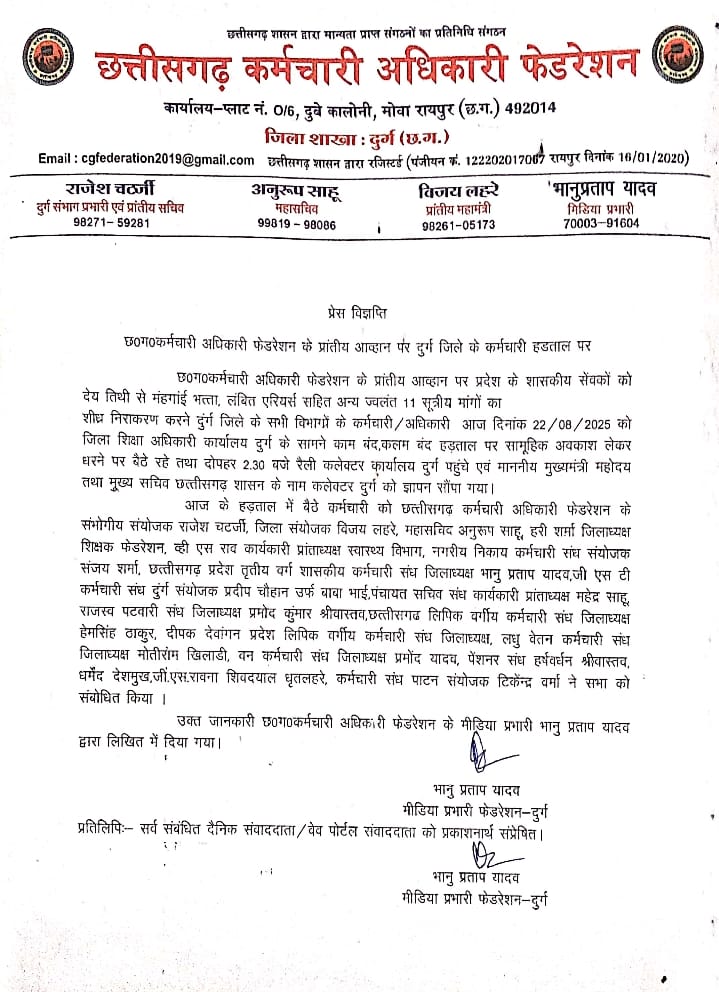 दुर्ग | छत्तीसगढ़ कर्मचारी अधिकारी फेडरेशन के प्रांतीय आव्हान पर आज दुर्ग जिले के विभिन्न विभागों के शासकीय कर्मचारी और अधिकारी कामबंद-कलमबंद हड़ताल पर रहे। सभी कर्मचारी सामूहिक अवकाश लेकर जिला शिक्षा अधिकारी कार्यालय दुर्ग के सामने धरने पर बैठे और अपनी 11 सूत्रीय मांगों के समर्थन में आवाज बुलंद की।