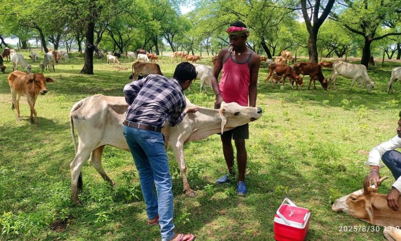 पशु चिकित्सा शिविर में मवेशियों को लम्फी बीमारी से बचाव हेतु टीकाकरण