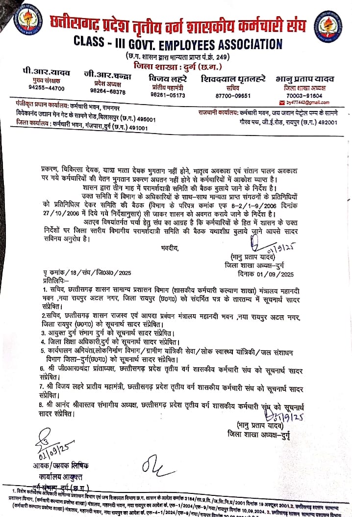 उन्होंने कलेक्टर दुर्ग से मांग की है कि शासन के निर्देशों का पालन करते हुए शीघ्र बैठक आयोजित की जाए, जिससे कर्मचारियों की लंबित समस्याओं का निराकरण हो सके।