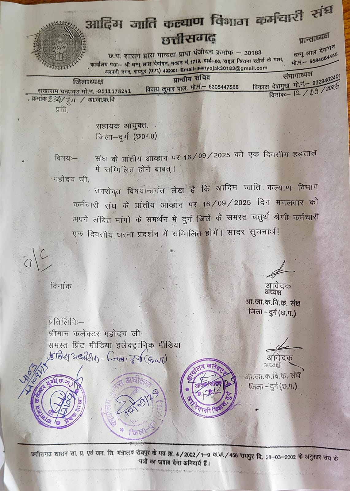 दुर्ग। आदिम जाति कल्याण विभाग कर्मचारी संघ ने अपने लंबित मांगों के समर्थन में 16 सितंबर 2025 को दुर्ग- रायपुर में एक दिवसीय धरना-प्रदर्शन करने का निर्णय लिया है। संघ के प्रांतीय आह्वान पर यह आंदोलन जिलेभर में किया जाएगा।