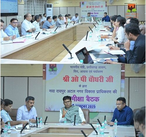 नवा रायपुर | नवा रायपुर अटल नगर विकास प्राधिकरण में आज वित्त, आवास एवं पर्यावरण मंत्री ओ.पी. चौधरी की अध्यक्षता में निवेश, अधोसंरचना विकास और जनसुविधाओं से संबंधित कार्यों की प्रगति की समीक्षा बैठक आयोजित हुई।