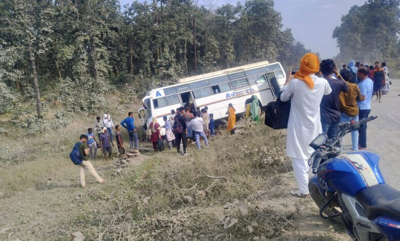 बलरामपुर। जिले से एक सड़क दुर्घटना की खबर सामने आई है, जहां यात्रियों से भरी एक बस अनियंत्रित होकर सड़क किनारे गड्ढे में उतर गई। गनीमत रही कि बस एक कटे हुए पेड़ के सहारे रुक गई, जिससे बड़ा हादसा टल गया और सभी यात्री सुरक्षित हैं।