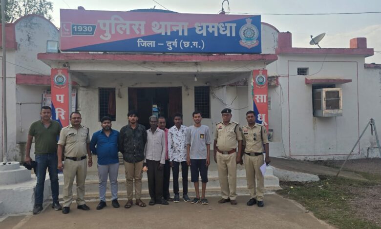 पुलिस ने इस मामले में भागवत ठाकुर (65, ग्राम राहतादाह), हरिश्चंद्र यादव (35, यादव पारा), मुकेश पटेल (25, ग्राम परसकोल), बी ईश्वर राव (38, सेक्टर 6 भिलाई), जवाहर सोनी (60, यादव पारा) और हेमंत सिन्हा (28, ग्राम डेहरी चौकी, देवकर) को गिरफ्तार किया है।