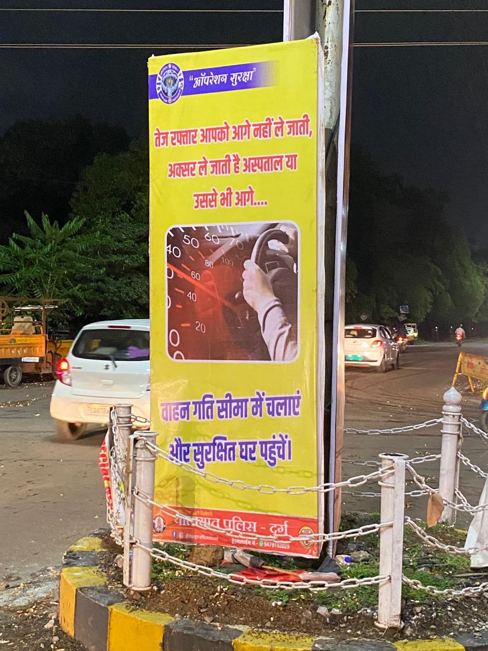 दुर्ग ; यातायात पुलिस दुर्ग द्वारा ऑपरेशन सुरक्षा के अंतर्गत शहर के नागरिकों को सुरक्षित यातायात के प्रति जागरूक करने के लिए व्यापक अभियान चलाया जा रहा है। इसी क्रम में सेंट्रल एवेन्यू रोड, भिलाई सहित प्रमुख चौक-चौराहों पर ड्रिंक एंड ड्राइव से बचें, ओवरस्पीडिंग न करें, हेलमेट अनिवार्य रूप से पहनें जैसे संदेशों वाले बैनर एवं पोस्टर लगाए गए हैं। इसका उद्देश्य सड़क सुरक्षा के प्रति नागरिकों में सकारात्मक व्यवहार परिवर्तन लाना है।