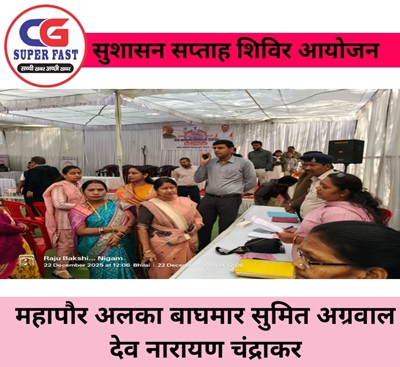 दुर्ग | नगर पालिक निगम दुर्ग सीमा क्षेत्र अंतर्गत आदित्य नगर जोन कार्यालय में सुशासन सप्ताह प्रशासन शहर की ओर अभियान के तहत जन समस्या निवारण शिविर का आयोजन किया गया। शिविर का उद्घाटन महापौर अलका बाघमार, आयुक्त सुमित अग्रवाल एवं लोक कर्म प्रभारी देव नारायण चंद्राकर ने भारत माता, छत्तीसगढ़ महतारी एवं महात्मा गांधी के तेलचित्र पर दीप प्रज्वलित कर किया।
