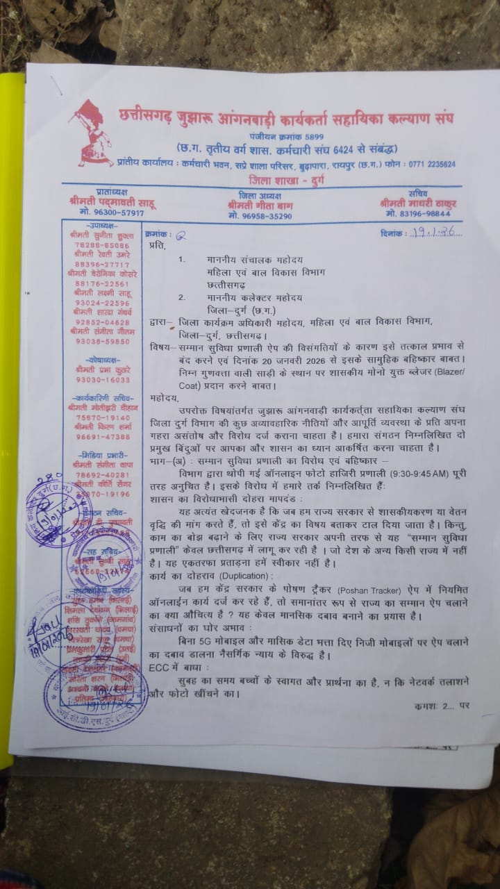 दुर्ग : जुझारू आंगनवाड़ी कार्यकत्रियों ने जिला महिला एवं बाल विकास विभाग की कुछ नीतियों और सम्मान सुविधा प्रणाली ऐप के कार्यान्वयन के खिलाफ गहरा असंतोष व्यक्त किया है। कार्यकत्रियों ने जिले के कार्यक्रम अधिकारी को पत्र भेजकर तत्काल प्रभाव से ऐप के बहिष्कार और नई मांगों का प्रस्ताव रखा है।