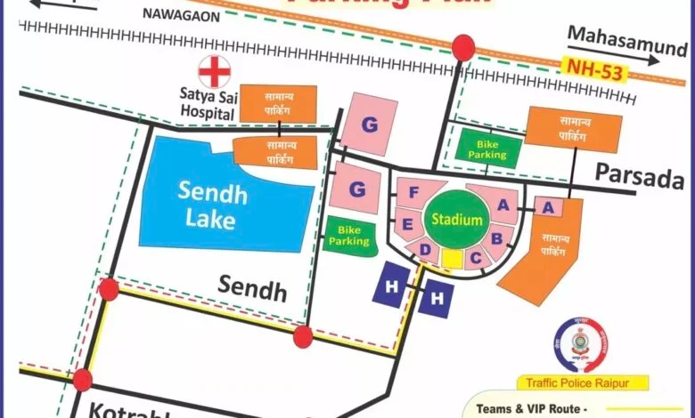 - रायपुर शहर से आने वाले दर्शक तेलीबांधा, सेरीखेड़ी ओवरब्रिज होते हुए स्टेडियम पहुंचेंगे। पार्किंग सत्य साईं अस्पताल और सेंध तालाब क्षेत्र में निर्धारित है।