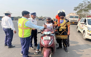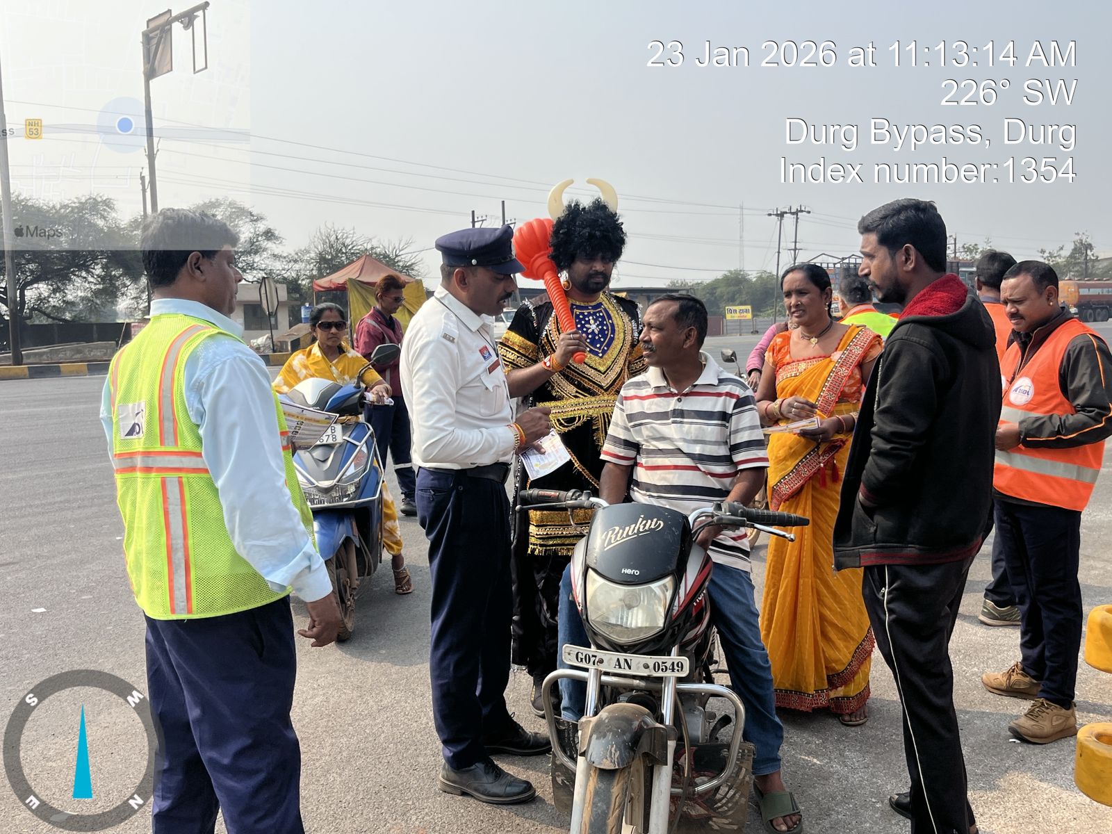 दुर्ग : राष्ट्रीय सड़क सुरक्षा माह 2026 के तहत यातायात पुलिस द्वारा नागरिकों को सड़क सुरक्षा एवं यातायात नियमों के प्रति जागरूक करने के उद्देश्य से एक अभिनव एवं प्रभावशाली जागरूकता कार्यक्रम का आयोजन किया गया। इस दौरान नेहरू नगर चौक, गुरुद्वारा तिराहा, नेहरू नगर क्षेत्र में यातायात पुलिस कर्मी द्वारा यमराज के कॉस्ट्यूम में आम नागरिकों से संवाद स्थापित किया गया।