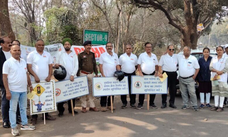दुर्ग : राष्ट्रीय सड़क सुरक्षा माह 2026 के अंतर्गत दिनांक 25.01.2026 को यातायात पुलिस दुर्ग एवं दिशा फाउंडेशन के संयुक्त तत्वावधान में सेक्टर-8 चौक, भिलाई नगर में विशेष सड़क सुरक्षा जागरूकता अभियान आयोजित किया गया। इस दौरान आम नागरिकों एवं वाहन चालकों को सड़क सुरक्षा तथा यातायात नियमों के पालन के महत्व के संबंध में जानकारी प्रदान की गई। अभियान के अंतर्गत बैनर एवं पोस्टर के माध्यम से लोगों को हेलमेट व सीट बेल्ट के अनिवार्य उपयोग, निर्धारित गति सीमा का पालन, गलत दिशा में वाहन न चलाने, नशे की हालत में वाहन न चलाने, मोबाइल फोन का प्रयोग करते हुए वाहन न चलाने एवं सुरक्षित ड्राइविंग के नियमों से अवगत कराया गया।