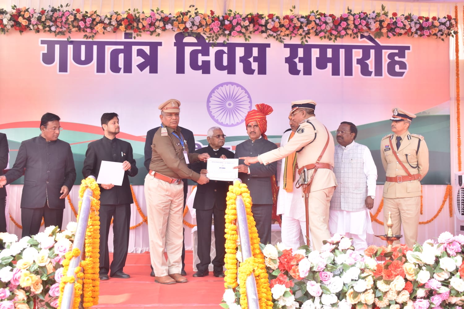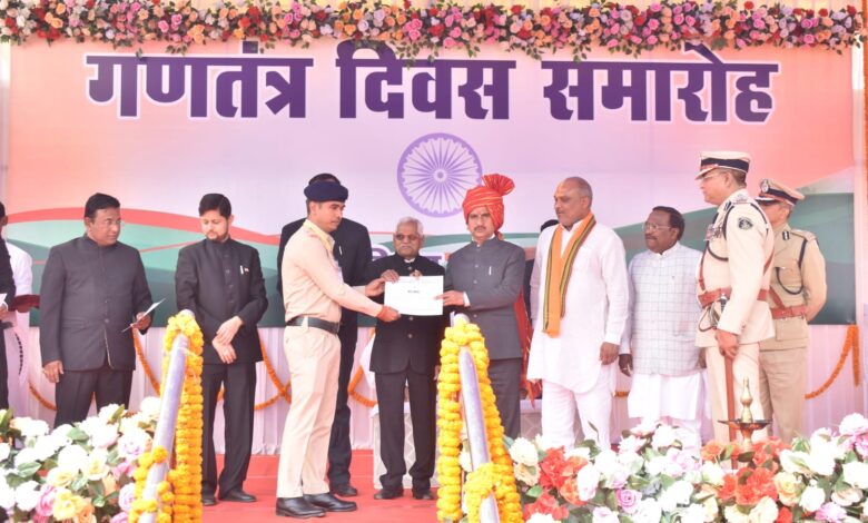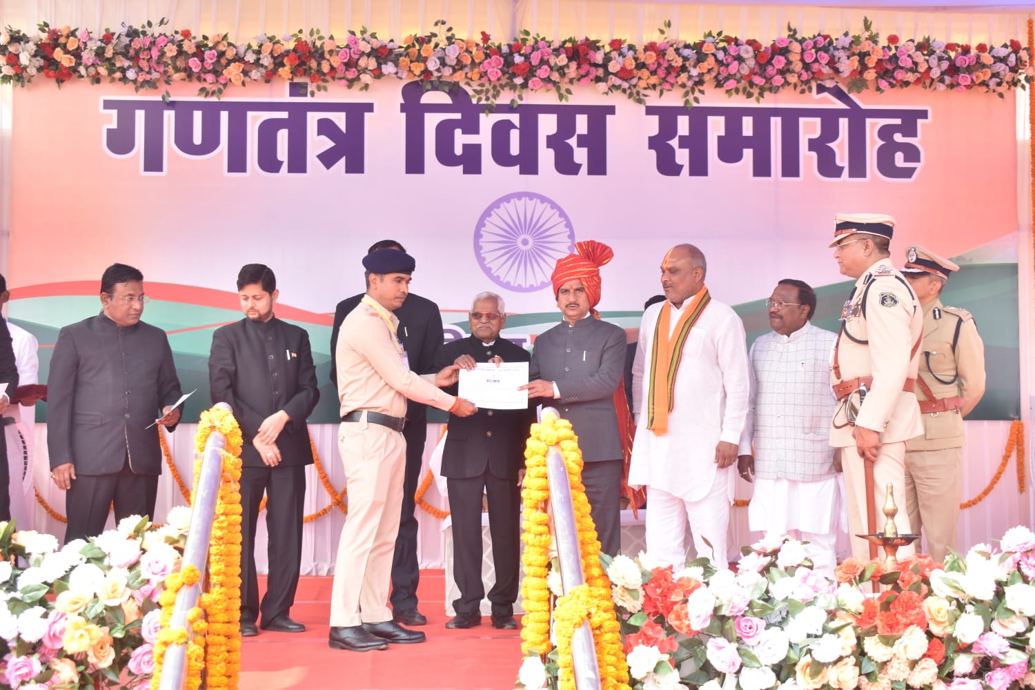 दुर्ग : गणतंत्र दिवस के पावन अवसर पर पं. रविशंकर स्टेडियम, दुर्ग में आयोजित जिला स्तरीय गणतंत्र दिवस परेड समारोह में मुख्य अतिथि माननीय केंद्रीय राज्य मंत्री तोखन साहू द्वारा यातायात पुलिस दुर्ग के उत्कृष्ट कार्य करने वाले पुलिस कर्मियों को प्रशस्ति पत्र प्रदान कर सम्मानित किया गया। इस अवसर पर यातायात पुलिस में पदस्थ एएसआई सुशील पांडे, आरक्षक विजय शर्मा एवं आरक्षक राम साहू को उनके द्वारा कर्तव्य के प्रति निष्ठा, अनुशासन, जिम्मेदारीपूर्ण कार्यशैली एवं यातायात व्यवस्था को सुचारू बनाए रखने में किए गए उल्लेखनीय योगदान के लिए सम्मानित किया गया।