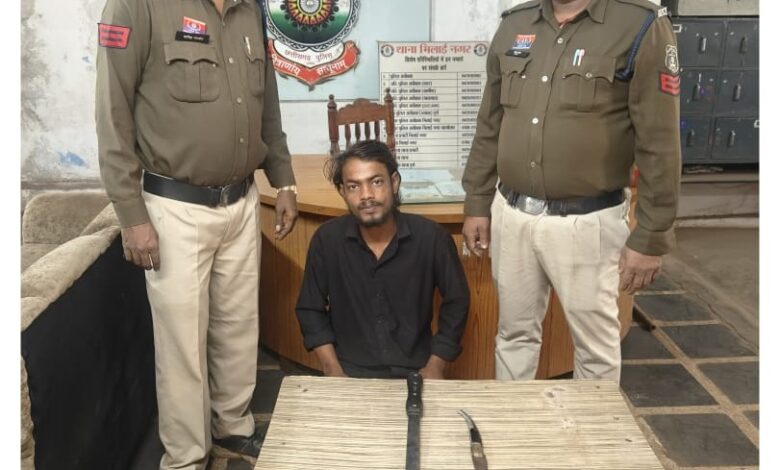 पूछताछ में आरोपी ने अपना नाम राजकिशोर राम उर्फ बबुआ, निवासी सेक्टर-06 तेलगू पारा, भिलाई नगर बताया। विधिवत तलाशी के दौरान आरोपी के कब्जे से एक धारदार तलवार और एक अन्य धारदार हथियार बरामद किया गया।