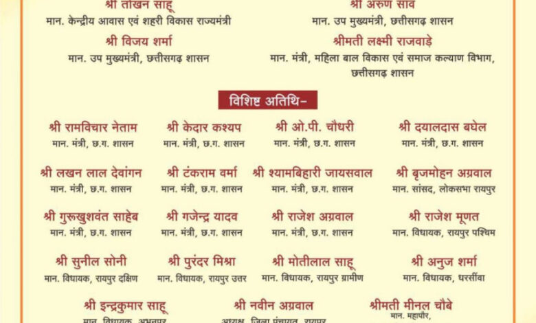 इस अवसर पर कार्यक्रम की अध्यक्षता विधानसभा अध्यक्ष डॉ. रमन सिंह करेंगे। कार्यक्रम में उप मुख्यमंत्री द्वय अरुण साव, विजय शर्मा, केंद्रीय आवास एवं शहरी विकास राज्य मंत्री तोखन साहू, महिला एवं बाल विकास मंत्री मती लक्ष्मी राजवाड़े सहित मंत्रिमंडल के सदस्य, सांसद, विधायक एवं अन्य जनप्रतिनिधि विशेष रूप से उपस्थित रहेंगे।
