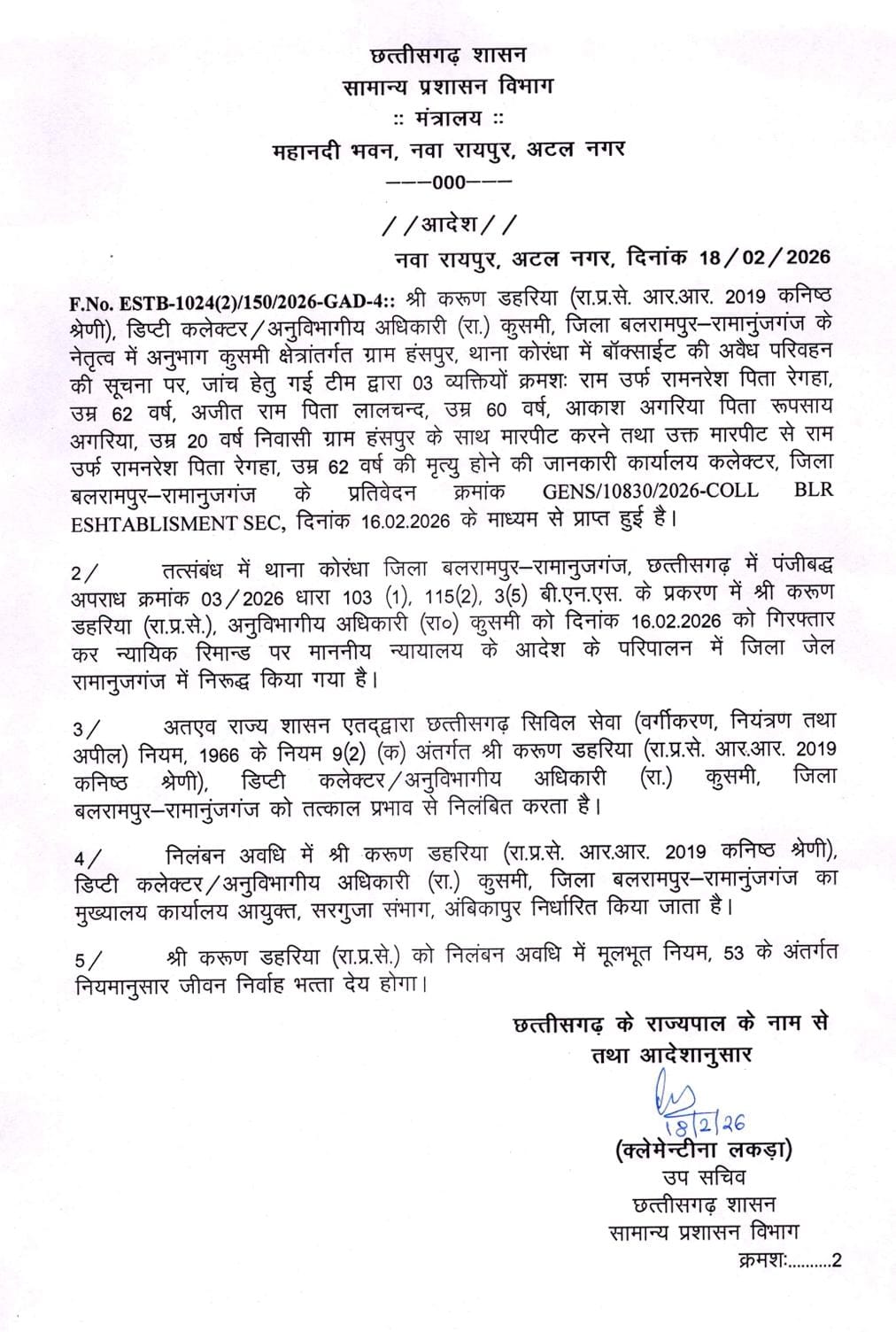 रायपुर। छत्तीसगढ़ शासन के सामान्य प्रशासन विभाग ने बलरामपुर-रामानुजगंज जिले के कुसमी के डिप्टी कलेक्टर और अनुविभागीय अधिकारी (राजस्व) करुण डहरिया को तत्काल प्रभाव से निलंबित कर दिया है। यह कार्रवाई ग्राम हंसपुर में हुई हत्या के मामले में उनकी गिरफ्तारी के बाद की गई।