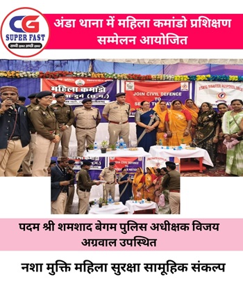 दुर्ग : थाना अंडा परिसर में महिला कमांडो के लिए सिविल डिफेंस प्रशिक्षण एवं प्रेरणा सम्मेलन आयोजित किया गया। कार्यक्रम में वरिष्ठ पुलिस अधीक्षक विजय अग्रवाल एवं पद्मश्री शमशाद बेगम की उपस्थिति रही।